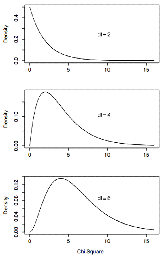 Chi Square distributions are positively skewed, but as the degrees of freedom increases, the degree of skew decreases and the Chi Square distribution approaches a normal distribution. Figure 9.1 shows density functions for three Chi Square distributions. Notice how the skew decreases as the degrees of freedom increases.