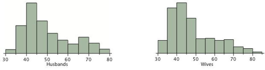 Each distribution is fairly skewed with a long right tail. From Table 3.1 we see that not all husbands are older than their wives and it is important to see that this fact is lost when we separate the variables. That is, even though we provide summary statistics on each variable, the pairing within couple is lost by separating the variables. We cannot say, for example, based on the means alone what percentage of couples has younger husbands than wives. We have to count across pairs to find this out. Only by maintaining the pairing can meaningful answers be found about couples per se. Another example of information not available from the separate descriptions of husbands and wives’ ages is the mean age of husbands with wives of a certain age. For instance, what is the average age of husbands with 45-year-old wives? Finally, we do not know the relationship between the husband’s age and the wife’s age.
