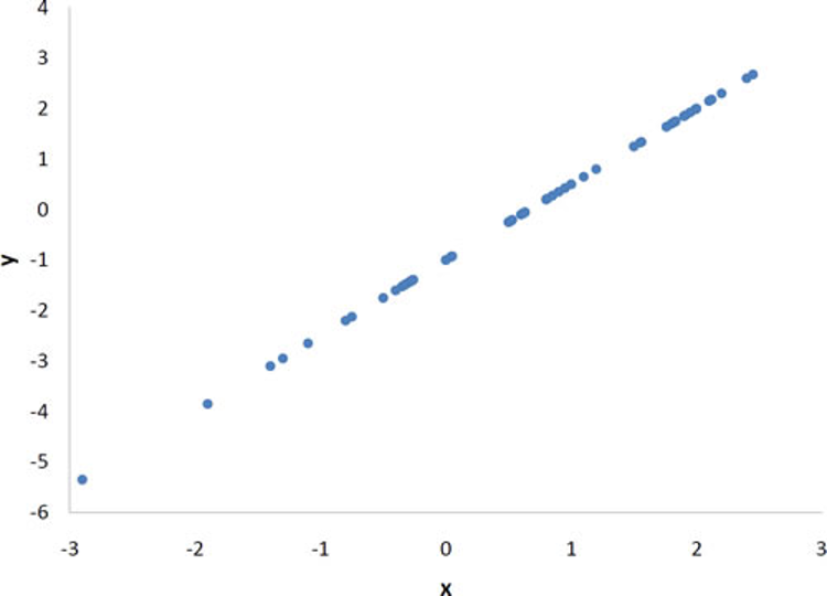 Pearson’s r can range from -1 to 1. An r of -1 indicates a perfect negative linear relationship between variables, an r of 0 indicates no linear relationship between variables, and an r of 1 indicates a perfect positive linear relationship between variables. Figure 3.5 shows a scatter plot for which r = 1.