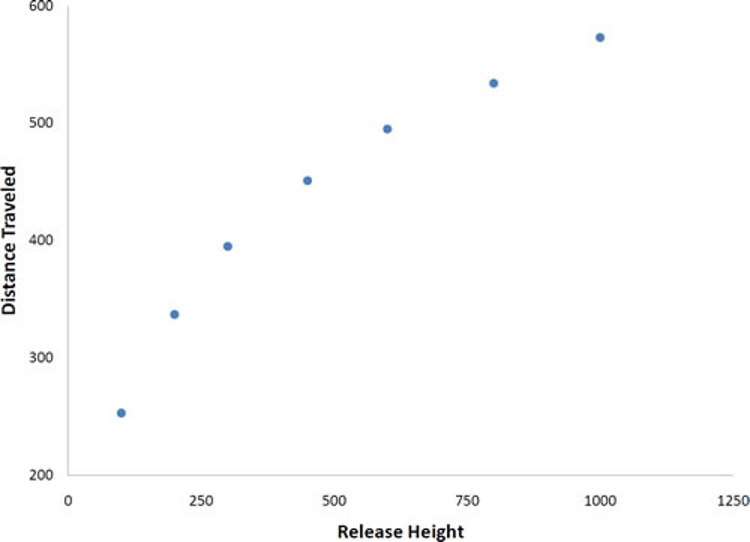 Not all scatter plots show linear relationships. Figure 3.4 shows the results of an experiment conducted by Galileo on projectile motion.2 In the experiment, Galileo rolled balls down an incline and measured how far they traveled as a function of the release height. It is clear from Figure 3.4 that the relationship between “Release Height” and “Distance Traveled” is not described well by a straight line: If you drew a line connecting the lowest point and the highest point, all of the remaining points would be above the line. The data are better fit by a parabola (a type of curved line).