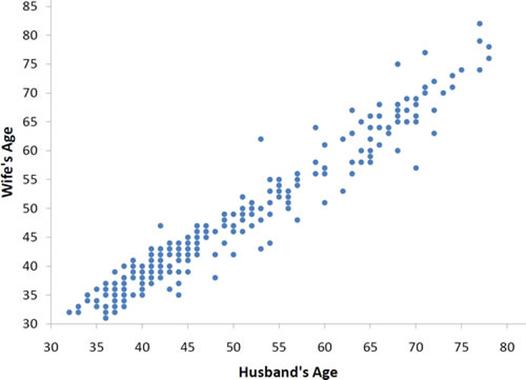 By way of illustration, let’s consider something with which we are all familiar: age. Let’s begin by asking if people tend to marry other people of about the same age. Our experience tells us “yes,” but how good is the correspondence? One way to address the question is to look at pairs of ages for a sample of married couples. Table 3.1 below shows the ages of 10 married couples. Going across the columns we see that, yes, husbands and wives tend to be of about the same age, with men having a tendency to be slightly older than their wives. This is no big surprise, but at least the data bear out our experiences, which is not always the case.