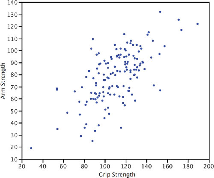 Figure 3.3 shows a scatter plot of Arm Strength and Grip Strength from 149 individuals working in physically demanding jobs including electricians, construction and maintenance workers, and auto mechanics. Not surprisingly, the stronger someone’s grip, the stronger their arm tends to be. There is therefore a positive association between these variables. Although the points cluster along a line, they are not clustered quite as closely as they are for the scatter plot of spousal age.