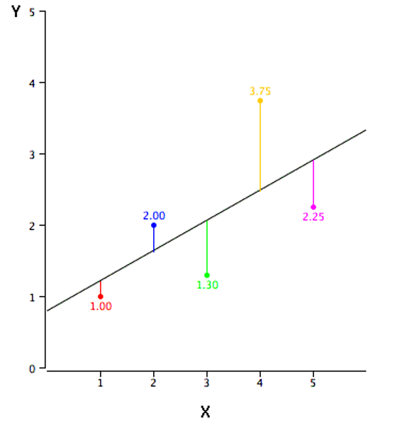 The error of prediction for a point is the value of the point minus the predicted value (the value on the line). Table 3.5 shows the predicted values (\(\hat{Y}\)) and the errors of prediction (\(Y-\hat{Y}\)). For example, the first point has a \(Y\) of 1.00 and a predicted \(Y\) (called \(\hat{Y}\)) of 1.21. Therefore, its error of prediction is -0.21.