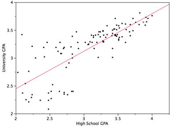 Figure 3.10 shows a scatter plot of University GPA as a function of High School GPA. You can see from the figure that there is a strong positive relationship. The correlation is 0.78. The regression equation is