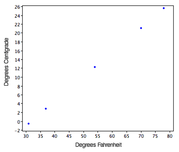 Figure 2.5 shows a plot of degrees Centigrade as a function of degrees Fahrenheit. Notice that the points form a straight line. This will always be the case if the transformation from one scale to another consists of multiplying by one constant and then adding a second constant. Such transformations are therefore called linear transformations.