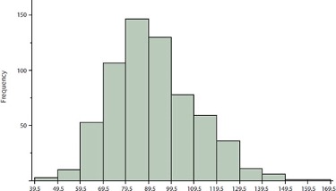 Measures of central tendency are shown in Table 2.3. Notice they do not differ greatly, with the exception that the mode is considerably lower than the other measures. When distributions have a positive skew, the mean is typically higher than the median, although it may not be in bimodal distributions. For these data, the mean of 91.58 is higher than the median of 90.
