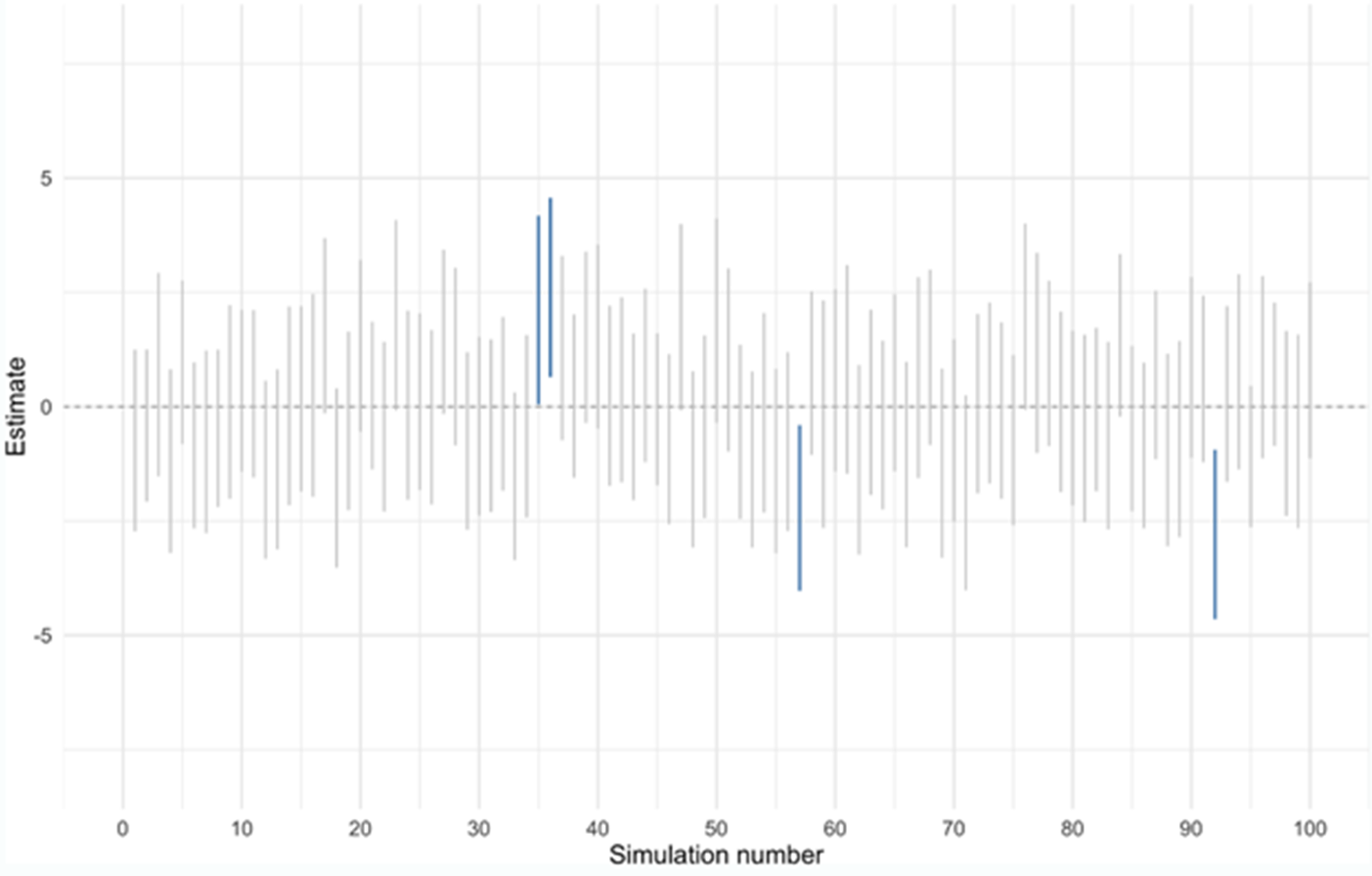 This property of 95% confidence intervals is demonstrated in Figure 4.1,3 which shows the results of a simulation in which random samples were drawn again and again, to see how interval estimates behave. Suppose the population mean is zero and each vertical bar represents a different random sample and the resulting confidence interval. As you can see, most intervals overlap with the true population mean of zero (on the y axis), but we also expect one out of every 20 estimates (5%) to miss the mark (the bars shown in blue). In practice, we would normally only have one sample and wouldn’t know for sure if ours is one of the unlucky cases in which the confidence interval fails to include the population mean. What we do know is that we’ve followed a process that gives a correct answer 19 times out of 20.