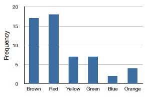 I recently purchased a bag of Plain M&M’s. The M&M’s were in six different colors. A quick count showed that there were 55 M&M’s: 17 brown, 18 red, 7 yellow, 7 green, 2 blue, and 4 orange. These counts are shown below in Table 5.1.