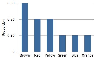 The distribution shown in Figure 5.1 concerns just my one bag of M&M’s. You might be wondering about the distribution of colors for all M&M’s. The manufacturer of M&M’s provides some information about this matter, but they do not tell us exactly how many M&M’s of each color they have ever produced. Instead, they report proportions rather than frequencies. Figure 5.2 shows these proportions. Since every M&M is one of the six familiar colors, the six proportions shown in the figure add to one. We call Figure 5.2 a probability distribution because if you choose an M&M at random, the probability of getting, say, a brown M&M is equal to the proportion of M&M’s that are brown (0.30).