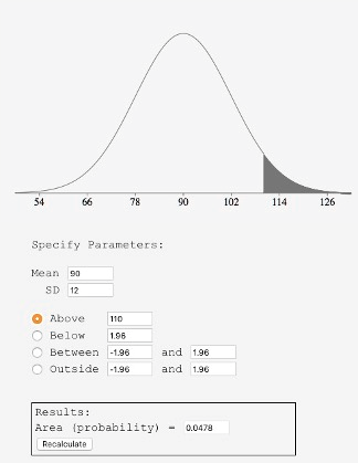 It is easy to find free online normal distribution calculators that will give you the areas under the normal distribution (e.g., https://onlinestatbook.com/2/calculators/normal_dist.html). For example, you can use one to find the proportion of a normal distribution with a mean of 90 and a standard deviation of 12 that is above 110 (Figure 5.14). Set the mean to 90 and the standard deviation to 12. Then enter “110” in the box to the right of the radio button “Above.” At the bottom of the display you will see that the shaded area is 0.0478. See if you can use the calculator to find that the area between 115 and 120 is 0.0124.