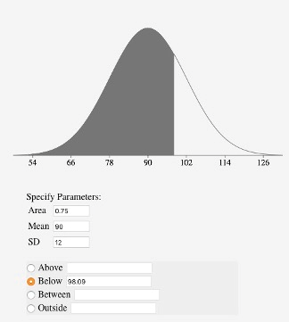 Say you wanted to find the score corresponding to the 75th percentile of a normal distribution with a mean of 90 and a standard deviation of 12. Using an inverse normal calculator (e.g., https://onlinestatbook.com/2/calculators/inverse_normal_dist.html), you enter the parameters as shown in Figure 5.15 and find that the area below 98.09 is 0.75.