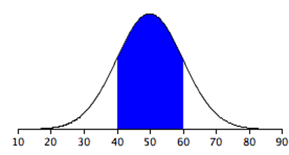 Areas under portions of a normal distribution can be computed by using calculus. Since this is a non-mathematical treatment of statistics, we will rely on computer programs and tables to determine these areas. Figure 5.11 shows a normal distribution with a mean of 50 and a standard deviation of 10. The shaded area between 40 and 60 contains 68% of the distribution.