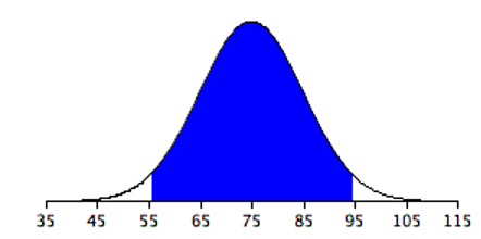 Figure 5.13 shows a normal distribution with a mean of 75 and a standard deviation of 10. The shaded area contains 95% of the area and extends from 55.4 to 94.6. For all normal distributions, 95% of the area is within 1.96 standard deviations of the mean. For quick approximations, it is sometimes useful to round off and use 2 rather than 1.96 as the number of standard deviations you need to extend from the mean so as to include 95% of the area.