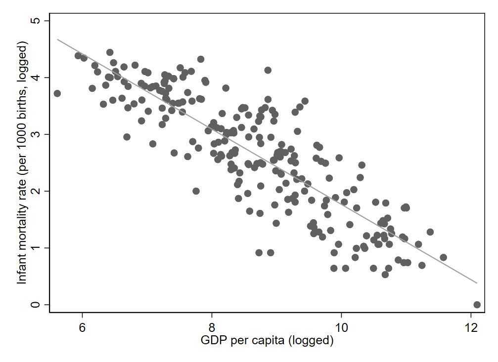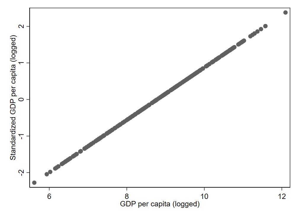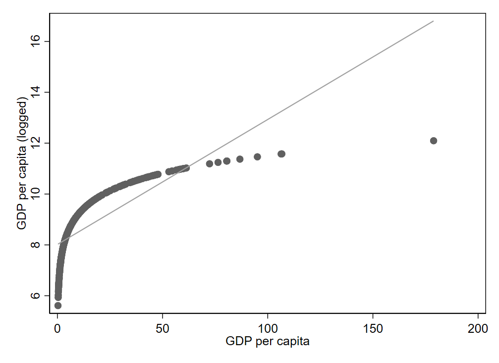 Because Pearson’s correlation measures linear relationships, data that perfectly follow a curved line will not have a correlation of 1. Figure 3.7 shows GDP per capita plotted against its log transformation. Because log transformations are non-linear transformations, the data does not follow a straight line. The correlation of 0.79 indicates that the data still maps reasonably well to the straight regression line shown in the figure, but this coefficient falls well short of 1 even though we can perfectly determine the value of y (logged GDP per capita) if we know the value of x (GDP per capita). Put differently, there is a perfect relationship between the two variables—just not a linear one. Of course, the reason there is a perfect relationship is because one variable is a transformed version of the other variable. We do not normally expect to encounter variables that are perfectly related unless they are measuring they exact same thing.