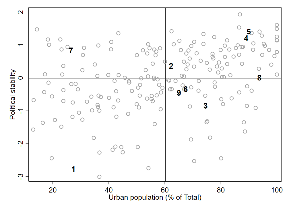 Visually, we can depict the relationship between two quantitative variables using a scatter plot. Figure 3.1 shows an example using data from the 2018 World Bank Development Indicators dataset.1 Two variables are depicted: a common measure of country wealth (logged per capita GDP) and an estimate of perceived political stability that the World Bank generates by combining several data sources. This latter measure is reported in standardized units (z-scores).