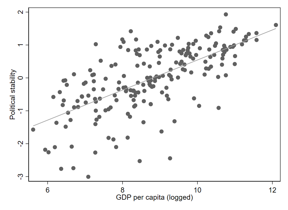 For this first example, the correlation is 0.66, which indicates a positive and moderately strong relationship. The correlation matches what we see visually: it is clear that typical values for political stability tend to be higher when GDP per capita is higher. We can therefore say there is a clear, positive association between wealth and political stability (the terms “association” and “relationship” are interchangeable).