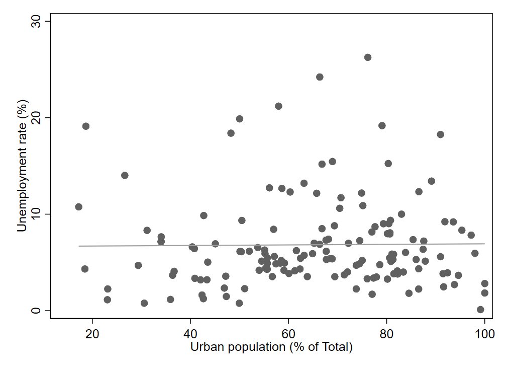 As another example, consider Figure 3.3. The data does not clearly follow any upward or downward trendline. In fact, the regression line in the graph is almost completely flat. The correlation is 0.01, which is very close to 0. Thus, there appears to be no relationship between the variables of urban population and unemployment rate.