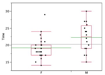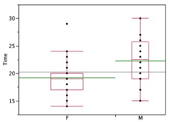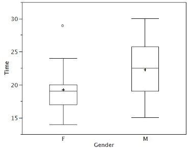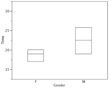 Box plots are useful for making comparisons and identifying outliers, meaning unusually large or small values for a variable. We will explain box plots with the help of data from an in-class experiment. As part of the “Stroop Interference Case Study,”9 students in introductory statistics were presented with a page containing 30 colored rectangles. Their task was to name the colors as quickly as possible. Their times (in seconds) were recorded. We’ll compare the scores for the 16 men and 31 women who participated in the experiment by making separate box plots for each gender. Such a display is said to involve parallel box plots.