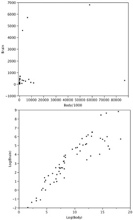 Figure 2.14 shows an example of how a log transformation can make patterns more visible. Both graphs plot the brain weight of animals as a function of their body weight. The raw weights are shown in the upper panel; the log-transformed weights are plotted in the lower panel.