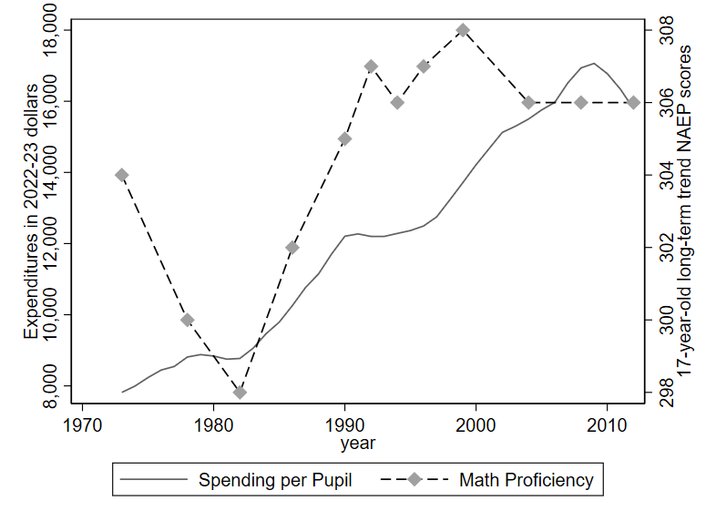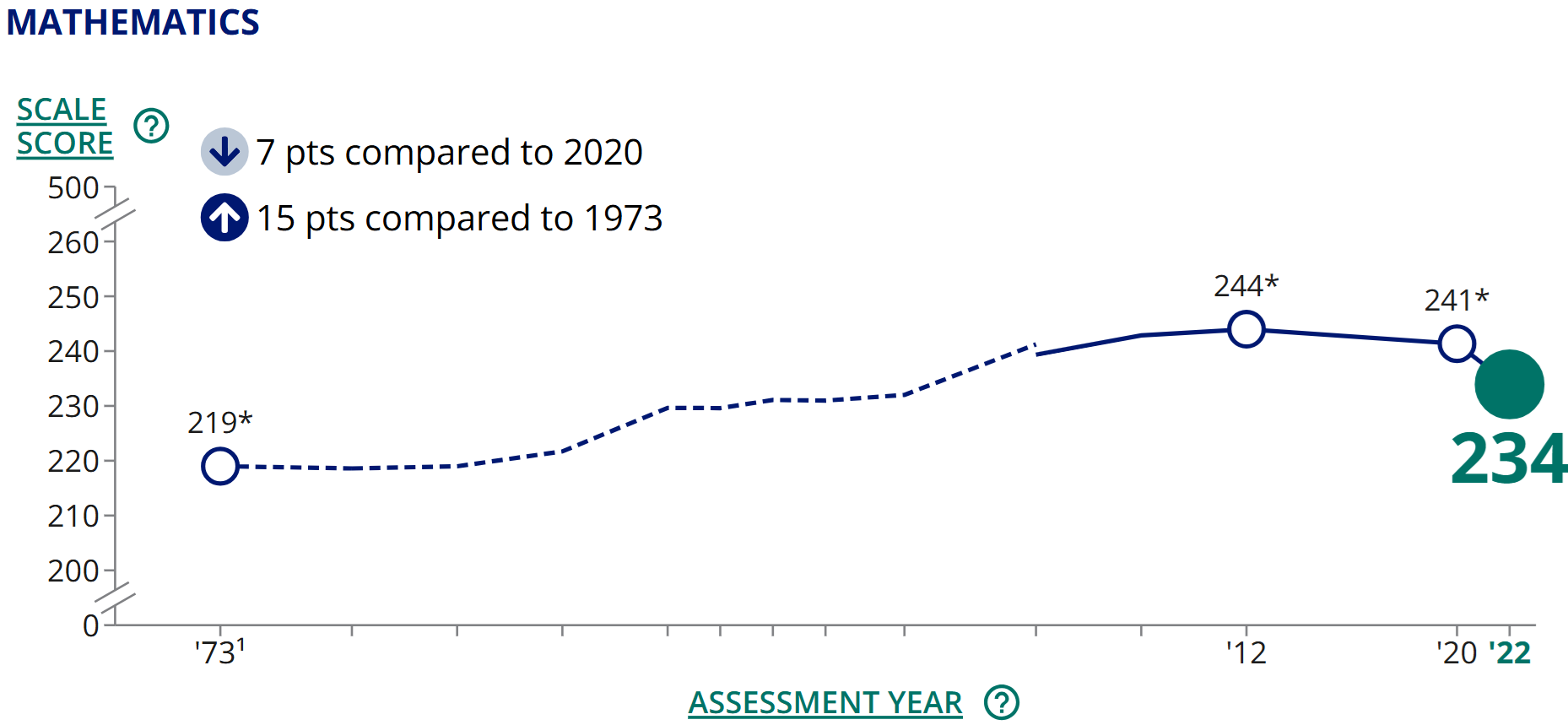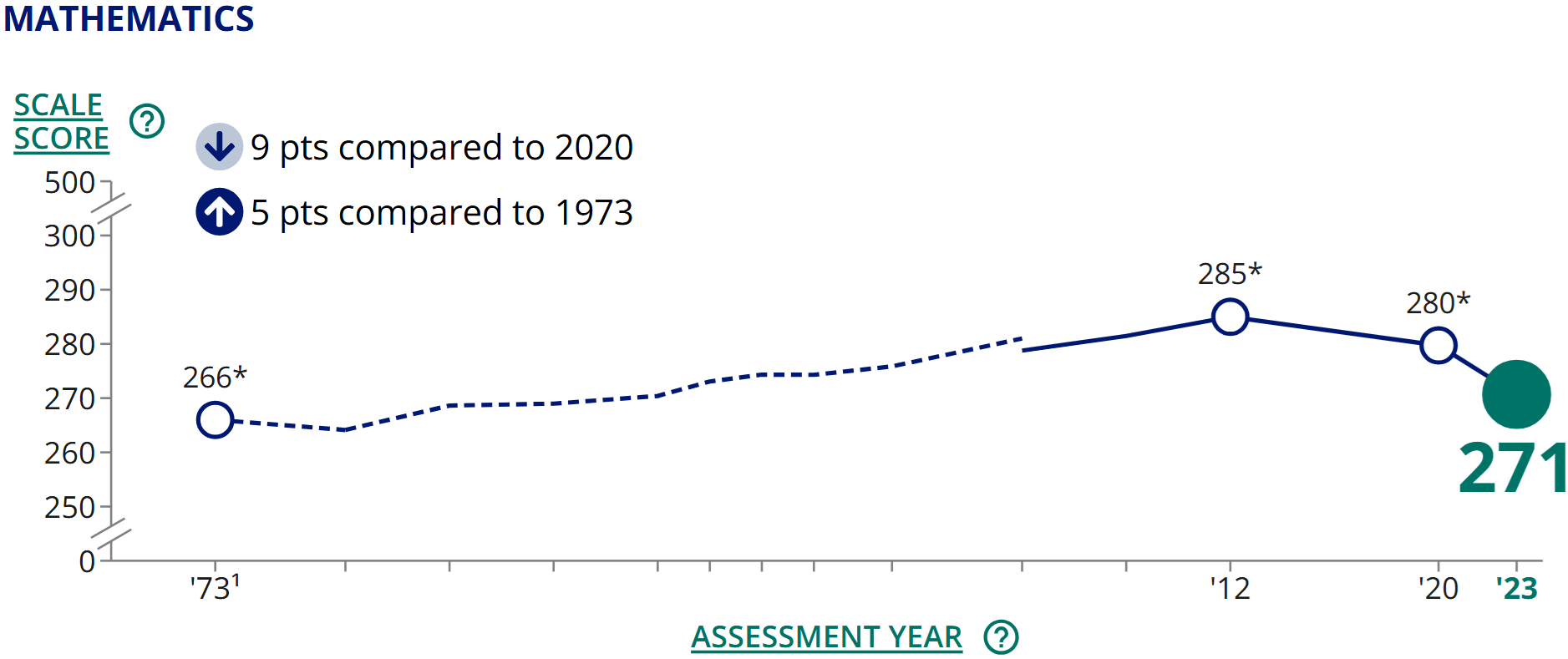 U.S. Department of Education, Institute of Education Sciences, National Center for Education Statistics, National Assessment of Educational Progress (NAEP), various years, 1971–2023 Long-Term Trend Reading and Mathematics Assessments. https://www.nationsreportcard.gov/ltt↩︎