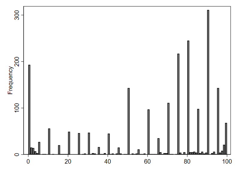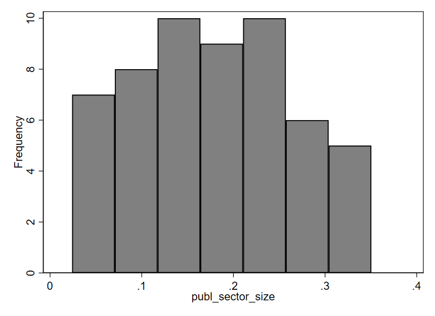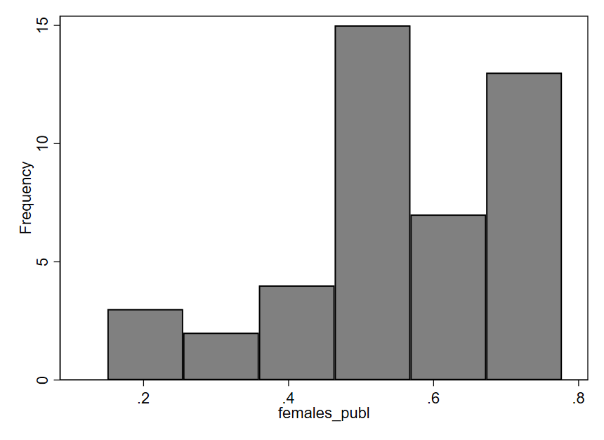 Now, let’s examine a histogram for the variable females_publ, which indicates the proportion of public sector employees who are female. In this graph, we can notice a certain asymmetry: the bars on the right half of the graph tend to be taller than those on the left. The short bars indicate that relatively few countries have proportions in the approximate range of .1 to .45; in other words, for a small number of countries, we see that 10-45% of the public workforce is female. Most countries have a public workforce that is more like 45-75% female (the tall bars on the right side of the graph). Thus, it seems that in a majority of the 44 countries included in this dataset, the public sector employs more females than males.