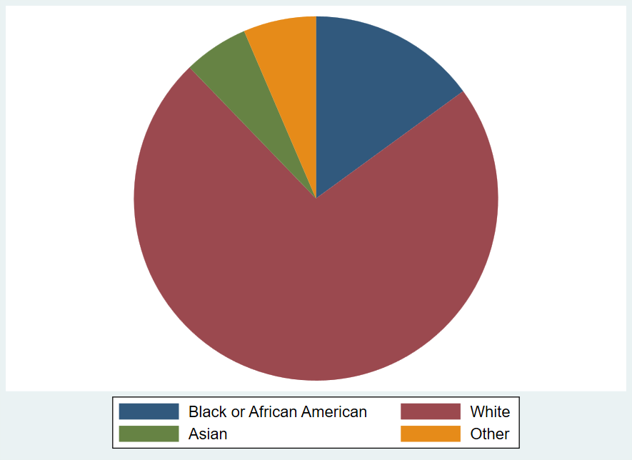 One can quickly see from Figure 1.4 that the most common value for the race variable is White, meaning that most U.S. government employees responding to the survey are White. We also see that the values of Asian and Other are fairly rare (each occurring in fewer than 10% of observations). Black or African American occurs a bit more frequently (around 15% of observations).