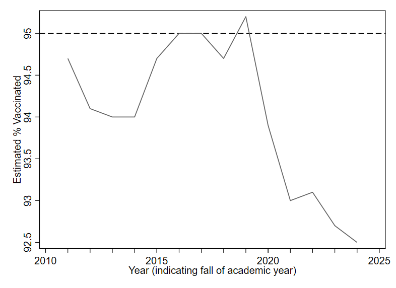 It is sometimes tempting to create simplistic rules to try to avoid misleading graphs like the one from the prior example. Such rules are generally a bad substitute for carefully thinking through how to best describe the data in front of us. As an example, it is sometimes advised to always including 0 in the y axis in order to avoid “zooming in” on the y axis so much that we make small differences appear larger than they really are. Let’s consider this rule in the context of some data on trends in childhood vaccination.