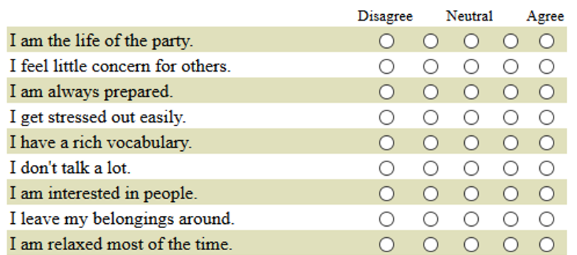 Let’s say I’m interested in studying how personality relates to gender. The most common model of personality in psychology is called the “Big Five.” One common measure consists of 50 survey items (the IPIP Big-Five Factor Markers), with 10 items for each of the five personality traits from the model.4 Figure 4.6 shows some of these questions and how they are formatted.