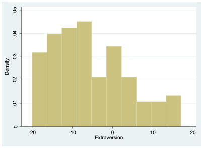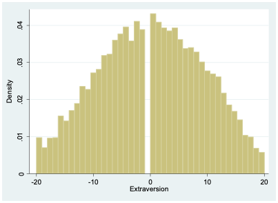 For all of the odd-numbered extraversion questions (e1, e3, e5, etc.), agreement indicates extraversion. For the even-numbered items (e2, e4, e6, etc.), agreement indicates introversion. To create a single extraversion variable that combines responses from all 10 survey items, I create a tally, adding up all the values for odd-numbered questions and then subtracting the responses to the even-numbered questions. An extreme extrovert will have a 5 for all the odd-numbered questions and a 1 for all of the even-numbered ones, giving them a score of 20 (\(5 \times 5-5 \times 1=20\)). An extreme introvert will have a -20 since they will answer 1 to all the odd-numbered questions and 5 to all the even-numbered ones (\(5 \times 1-5 \times 5=-20\)).