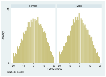 If I want to describe differences in extraversion by gender in this dataset, I can compute the mean value of extraversion for males and for females. It turns out that males have an average extraversion of -0.46 while females’ average level of extraversion is 0.53. Thus, the average female is about 1-point more extroverted than the average male. But of course, there is abundant variation in extraversion among both groups, as seen clearly in Figure 4.9. There are plenty of females who are introverts and plenty of males who are extroverts.