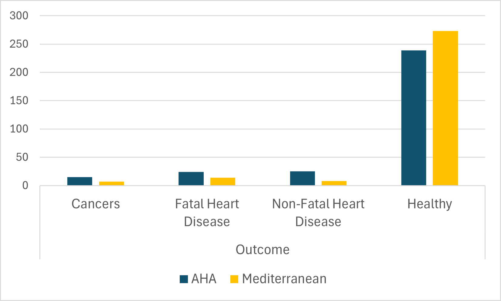 If we continue moving down the table column by column, we see that rates of heart disease are higher among those on the AHA diet (7.92% for fatal and 8.25% for non-fatal) than among those on the Mediterranean diet (4.64% and 2.65%). Finally, around 90% of those on the Mediterranean diet are healthy, while just under 79% of those on the AHA diet are.