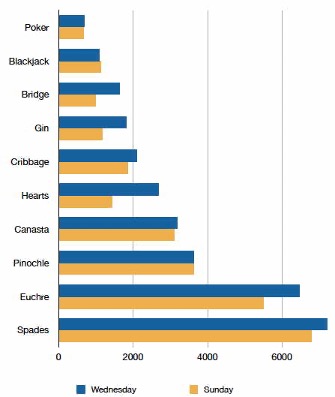 More broadly, suppose we are comparing the results of different surveys, or of different conditions within the same overall survey. Because a qualitative variable allows us to divide our sample into sub-samples (based on survey or condition) and then examine distributions for each sub-sample, we can say that we are comparing the “distributions” of responses between the surveys or conditions. Bar charts are often excellent for illustrating differences between two distributions. Figure 4.3 shows the number of people playing card games at the Yahoo website on a Sunday and on a Wednesday in the Spring of 2001. We see that there were more players overall on Wednesday compared to Sunday. The number of people playing Pinochle was nonetheless the same on these two days. In contrast, there were about twice as many people playing hearts on Wednesday as on Sunday. Facts like these emerge clearly from a well-designed bar chart.