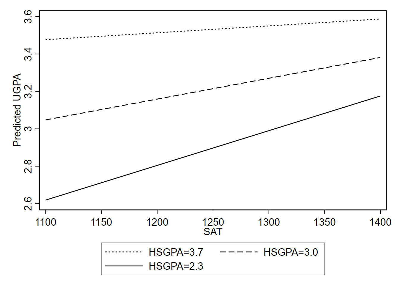 When we have nonlinear relationships, graphical depictions are typically helpful for demonstrating our results. Using statistical software, we can create a graph that shows us how the predicted value of UGPA changes depending on SAT and certain HSGPA values that we pick out for illustrative purposes. In this case, I chose values of 3.7 (approximately the 90th percentile), 2.3 (approximately the 10th percentile, and 3.0 (half way between the 10th and 90th percentiles).