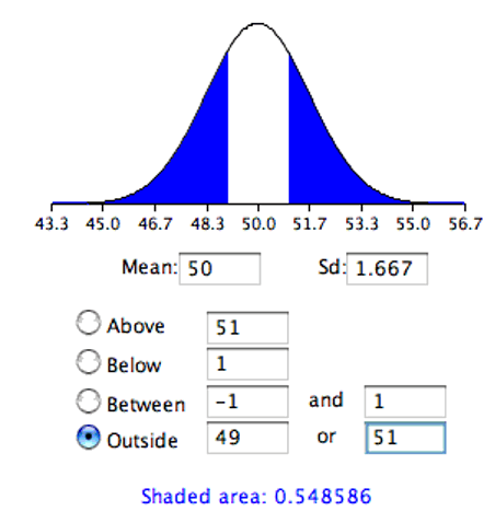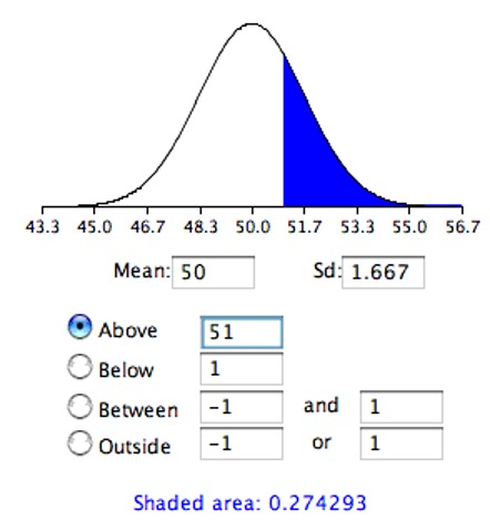 Notice that the mean is set to 50, the standard deviation to 1.667, and the area above 51 is requested and shown to be 0.274.