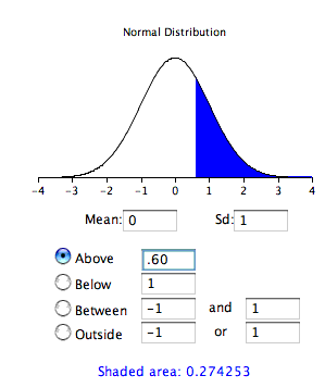 where \(z\) is the value on the standard normal distribution, \(\bar{x}\) is the sample mean, \(\mu_0\) is the hypothesized value of the mean (under the null hypothesis),17 and \(\sigma_{\bar{x}}\) is the standard error of the mean. For this example, \(z\) = (51-50)/1.667 = 0.60. Use a normal calculator, with a mean of 0 and a standard deviation of 1, as shown below.