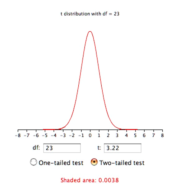 Therefore, t = 4.96/1.54 = 3.22. The probability value for t depends on the degrees of freedom. The number of degrees of freedom is equal to n - 1 = 23. As shown below, a t distribution calculator finds that the probability of a t less than -3.22 or greater than 3.22 is only 0.0038. Therefore, if the drug had no effect, the probability of finding a difference between means as large or larger (in either direction) than the difference found is very low. Therefore the null hypothesis that the population mean difference score is zero can be rejected. The conclusion is that the population mean for the drug condition is higher than the population mean for the placebo condition.