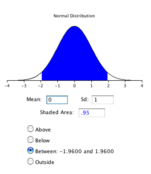 where \(z_{.95}\) is the number of standard deviations extending from the mean of a normal distribution required to contain 0.95 of the area (always equal to 1.96) and \(\sigma_{\bar{x}}\) is the standard error of the mean.