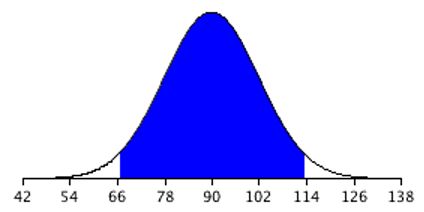 For the present example, the sampling distribution of the mean has a mean of 90 and a standard deviation of 36/3 = 12. Note that the standard deviation of a sampling distribution is its standard error. Figure 8.7 shows this distribution. The shaded area represents the middle 95% of the distribution and stretches from 66.48 to 113.52. These limits were computed by adding and subtracting 1.96 standard deviations to/from the mean of 90 as follows: