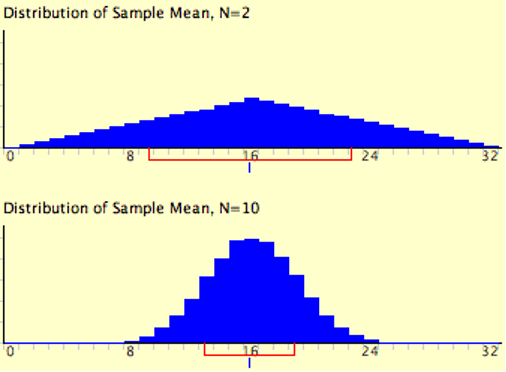 That is, the variance of the sampling distribution of the mean is the population variance divided by \(n\), the sample size (the number of scores used to compute a mean).3 (If not sampling from a population, the variance of the probability distribution from which the random variable is drawn is used rather than the population variance.) Thus, the larger the sample size, the smaller the variance of the sampling distribution of the mean.