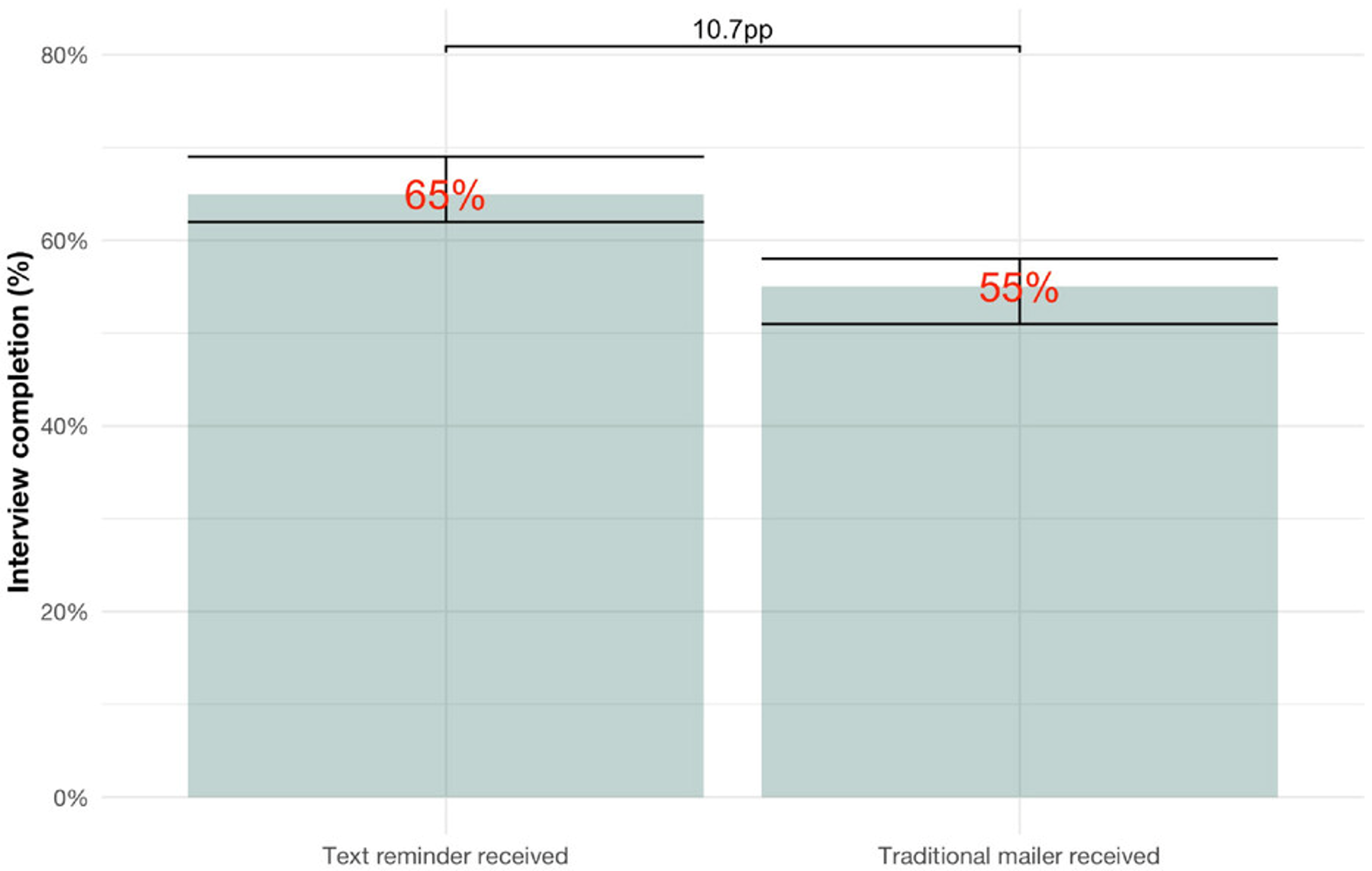 Returning to the example at the beginning of the chapter, we saw that researchers found that applicants for a food assistance program who received text reminders were 10.7 percentage points more likely to complete an interview than those in the control group who received no text reminders. This difference in the completion rate between the treatment and control groups (the sample statistic) serves as a point estimate for the parameter (effect of the text reminders). As we noted, this estimate is likely to be imperfect because of random differences in who gets assigned to the treatment versus control groups. To better convey the uncertainty surrounding a point estimate, it is helpful to provide an interval estimate. Interval estimates identify a range of likely values rather than a single number representing one’s best guess. For example, the researchers studying text reminders report a 95% confidence interval ranging from 5.8 to 15.5 percentage points. Thus, there is good reason to believe that the true effect size is at least 5.8 percentage points but no greater than 15.5 percentage points: